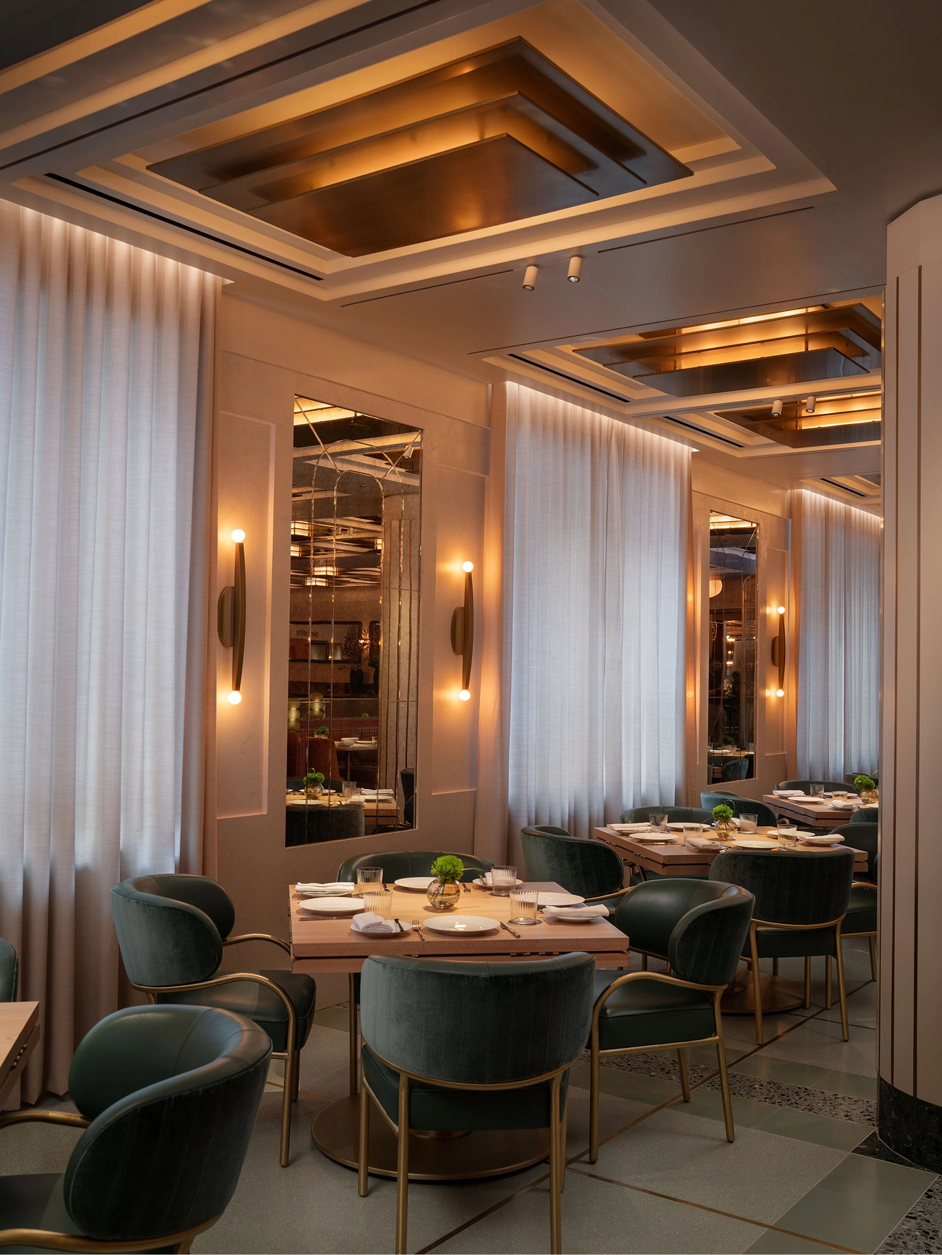 The coffered ceilings are arguably the star of the show featuring Art Deco stepped brass lighting fixtures that cast a warm glow over the dining room.